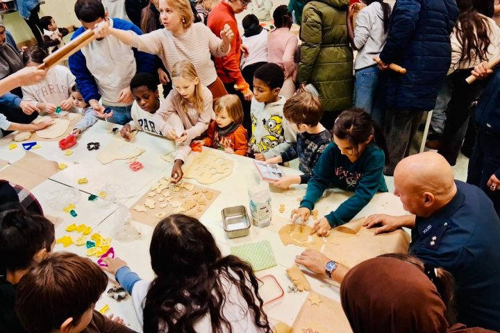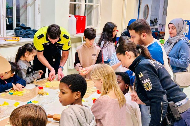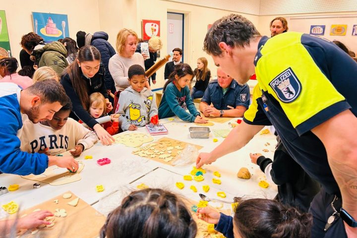 Von den 18 Kindern waren 16 Familien – oft mit Geschwistern – vertreten, sodass unser Schulhof wunderbar gefüllt und belebt war. Gemeinsam mit den anwesenden Polizisten wurden die mitgebrachten Plätzchen ausgestochen, verziert und gebacken. Dabei entwickelten sich viele Gespräche, und schnell entstand eine fröhliche, entspannte Atmosphäre.